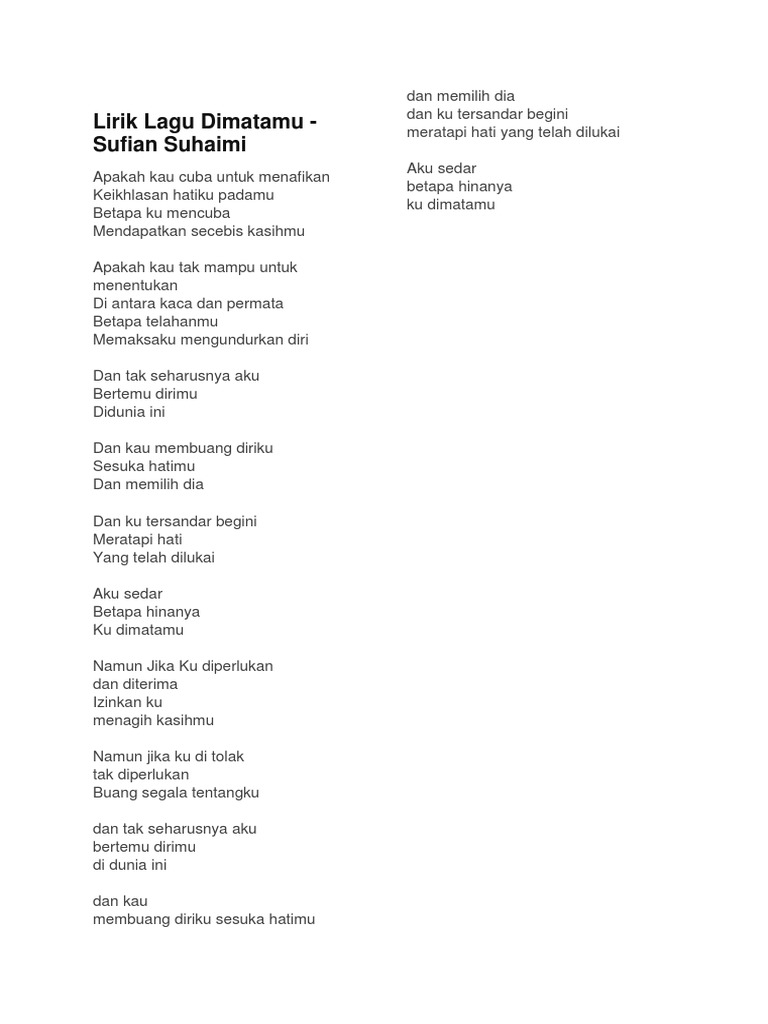Apakah kau cuba untuk menentukan keikhlasan hatiku padamu betapa ku mencuba mendapatkan. Lagu penuh yang diinspirasi video muzik. Apakah kau tak mampu tuk menentukan di antara kaca dan permata betapa telahanmu memaksaku mengundurkan diri. Lirik lagu dimatamu dari sufian suhaimi lagu ini adalah salah satu lagu yang dipopulerkan oleh sufian suhaimi silahkan selengkapnya baca disini. — sufian suhaimi mula mencipta nama di industri muzik tanah air melalui lagunya.
